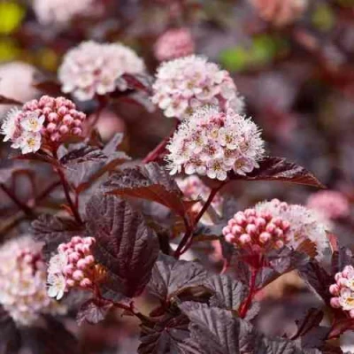 Пузыреплодник Андре — высокорослый калинолистный кустарник, который станет ярким акцентом в вашем саду или парковой зоне. Этот раскидистый сорт формирует густую шарообразную крону с поникающими побегами, достигая в высоту 2–3 м и ширину до 2 м. Листья резные, 3–5 лопастные, длиной до 10 см, окрашены в пурпурно-красный оттенок, а осенью приобретают бронзовый цвет. Молодые побеги розово-красные. Пузыреплодник калинолистный Андре украшен полушаровидными белыми или бледно-розовыми соцветиями и вздутыми листовками плодов, которые сначала красные, а при созревании становятся коричневыми, создавая декоративный эффект на протяжении всего сезона.
