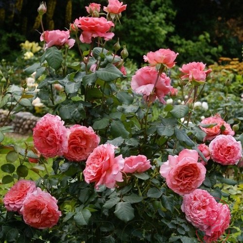 С июня и до самых заморозков куст высотой 70-80 см и шириной 60 см обильно покрывается цветами. Каждый бутон шаровидной формы раскрывается в чашевидный, махровый цветок диаметром 8-10 см. Окраска лепестков — утонченный лососево-розовый оттенок с более насыщенным, темным центром, создающим эффект сияния. Цветки, собранные в небольшие соцветия до 5 штук или одиночные, источают сильный фруктовый аромат с выразительными нотами малины. Куст декоративен и благодаря темно-зеленой полуглянцевой листве, сохраняющей привлекательность весь сезон.